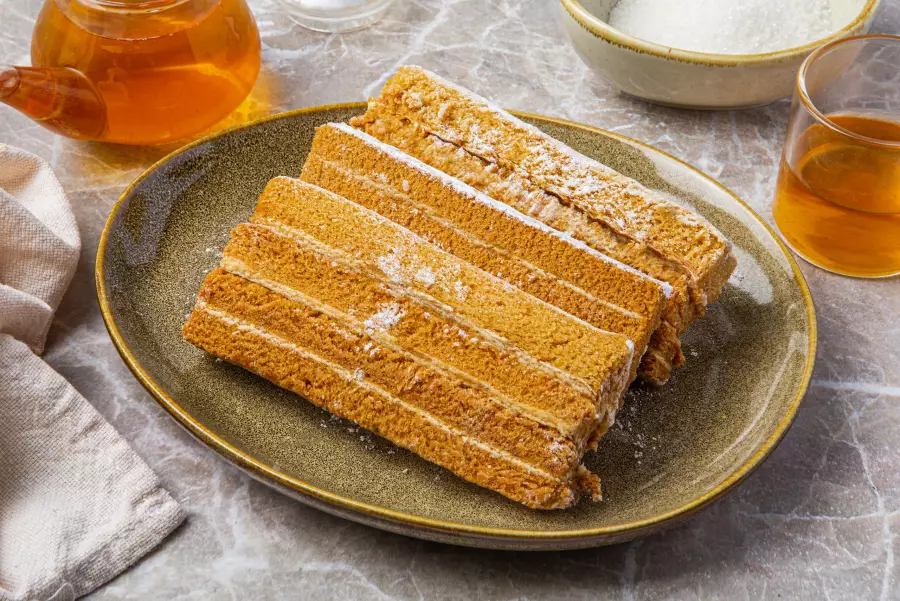 - Готовый пласт нарезать, укладывать слоями и прижимать.
