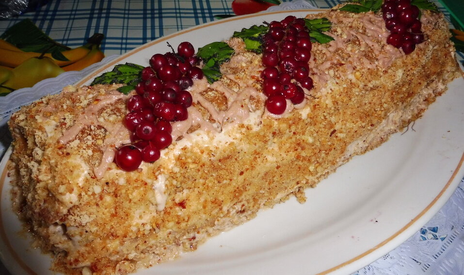 После того как рулет испечется, его нужно аккуратно свернуть в ковриках, оставив остывать. На остывшее тесто наносят крем из взбитой сметаны с медом и сахаром, добавляя какао по вкусу. Аккуратно сворачивая, рулет обсыпаем молотыми орехами, а верхнюю часть украшаем ягодами красной смородины. Это не только вкусно, но и эстетично.