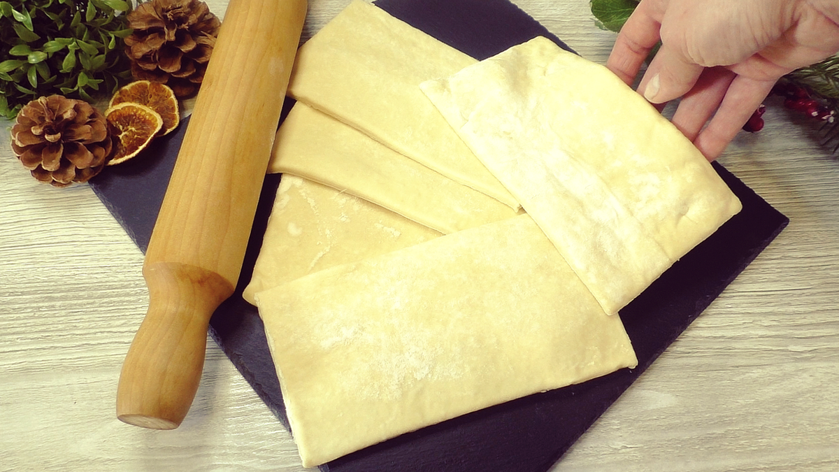 Для начала разморозьте слоеное тесто, если оно заморожено. Затем раскатайте его до толщины примерно 5 мм. Нарежьте на квадраты: уместно использовать кусочки размером 9х9 см, делив тесто пополам из исходного размера 9х18 см.