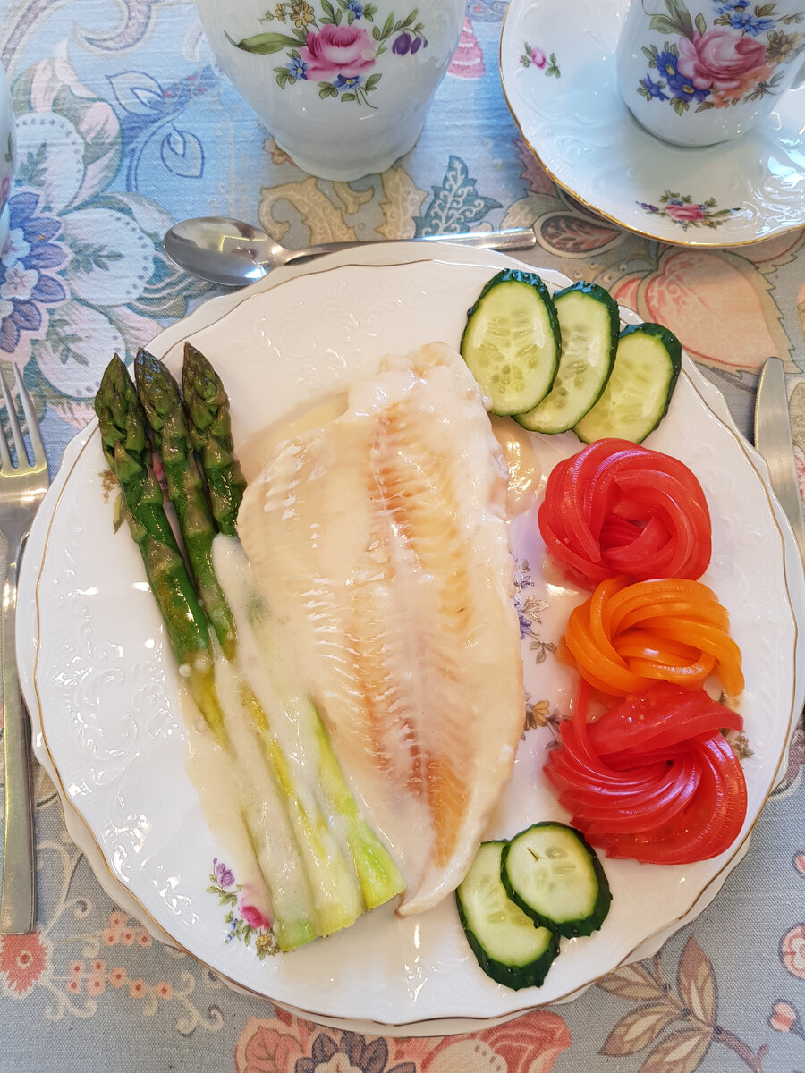 Теперь можно сервировать блюдо. Выложите на тарелку спаржу и треску, полейте все ароматным соусом. Для красоты можно украсить нарезанными помидорами и огурцами.