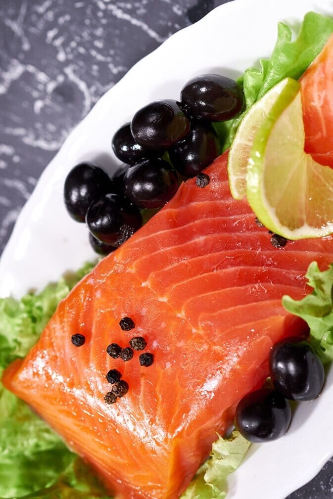 После этого убрать выделившийся рассол, нарезать лосося и подать к столу с маслинами и дольками лимона или лайма.