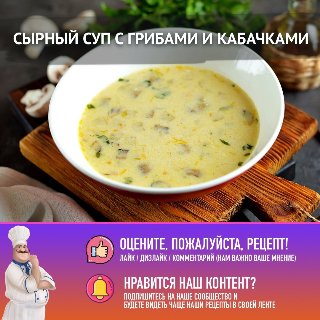 Этот насыщенный сырный суп на основе плавленых сырков с добавлением грибов и кабачков подойдёт как для детей, так и для взрослых. Время на его приготовление составляет всего 40 минут, а пищевая ценность составляет 80 кКал на 100 грамм.