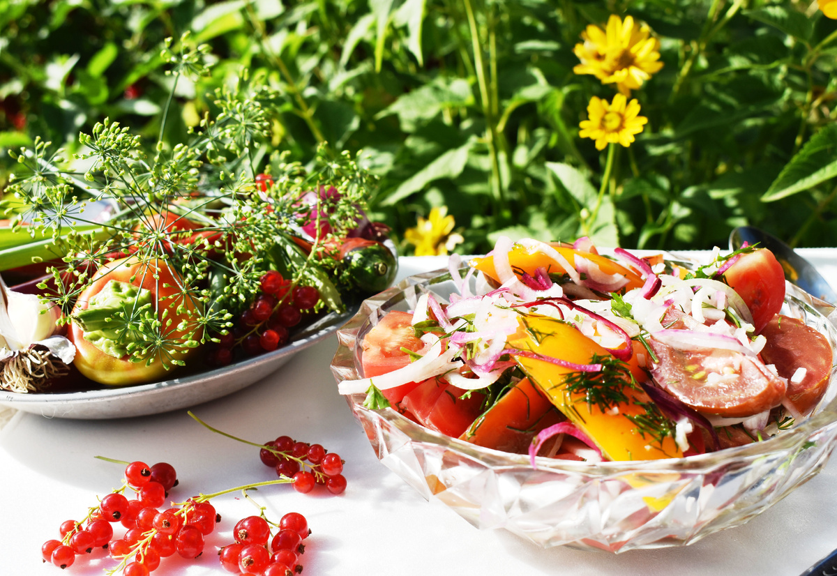 Летний салат из помидоров готов к подаче! Это идеальное дополнение к шашлыку, которое порадует всех присутствующих.