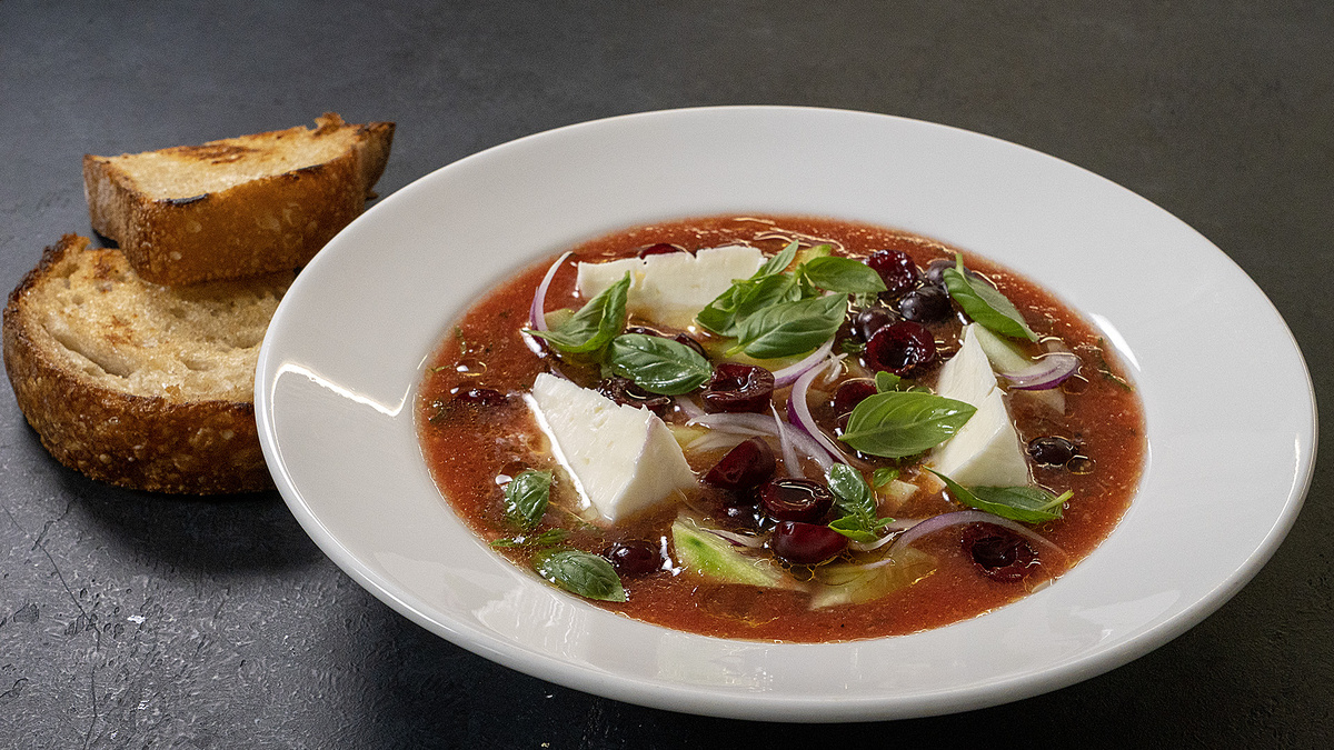 При подаче налейте томатную основу в глубокую тарелку, добавьте огурцы, моцареллу, лук, вишню и травы. Завершите блюдо сдобрив оливковым маслом и подайте с хрустящим хлебом, обжаренным на сливочном масле.