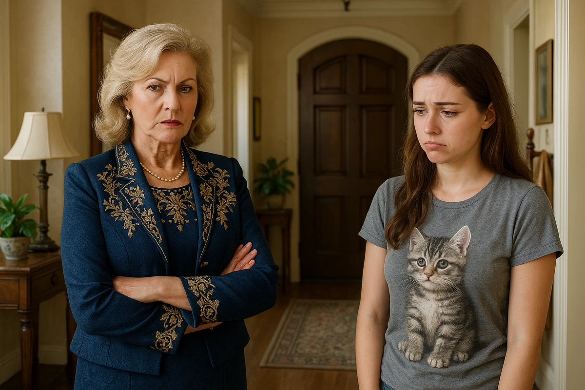 На пороге стоит свекровь: строгий костюм, идеально уложенные волосы и аромат дорогих духов. Она оценивающе смотрит на Настю, задержав взгляд на неприметной футболке с котом.