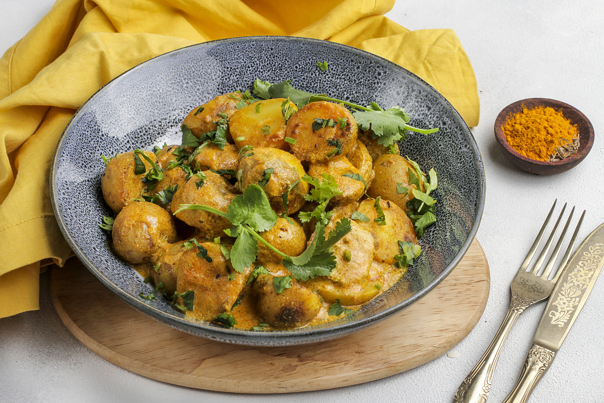 Вскипятите два литра подсоленной воды.Отварите тщательно промытый картофель в кожуре 8-10 минут до состояния полуготовности.Слейте воду, охладите и разрежьте клубни пополам.На сковороде разогрейте горчичное масло и обжарьте картофель 4-5 минут до появления золотистой корочки.Переложите картофель в миску, проколите его поверхность вилкой.В отдельной посуде смешайте фенхель, паприку, куркуму, асафетиду и гарам масалу с 80 мл воды.В другой миске соедините йогурт, сахар, нутовую муку и молотый имбирь.На разогретой сковороде с 1 ст. л. растительного масла обжарьте кардамон и гвоздику с зирой в течение 1 минуты.Снимите с огня и добавьте смесь специй с водой, готовьте на среднем огне до прекращения брызг.Затем влейте йогуртовую массу, нагревайте до появления первых пузырьков.Верните картофель, посолите и перемешайте.Накройте крышкой и тушите 10 минут до полной готовности, добавьте измельченную кинзу перед подачей.Это блюдо — отличный способ устроить кулинарное путешествие в мир восточной кухни, не выходя из дома!