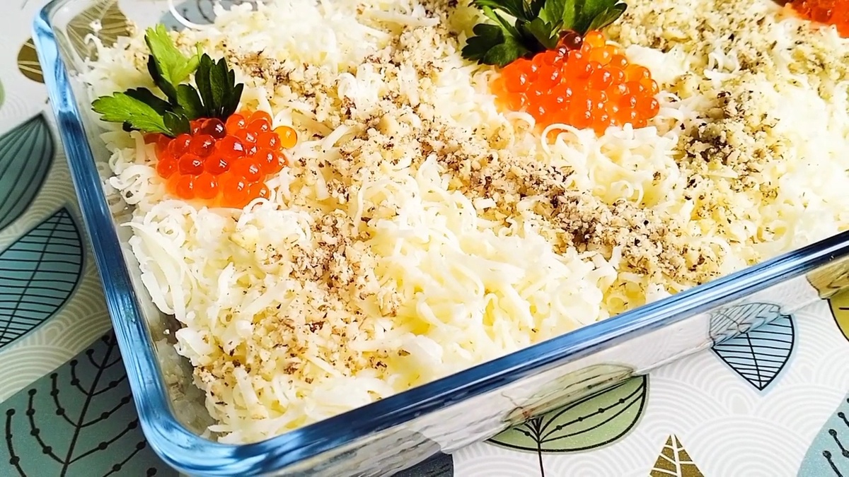 Самым финальным штрихом станет украшение вашего блюда: посыпьте измельченными грецкими орехами, добавьте немного красной икры и побрякушки зелени для яркости и апетита.