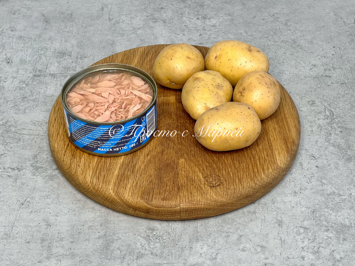 Пока картофель запекается, займёмся соусом. Возьмите консервированного тунца, слейте жидкость и добавьте его в миску. Затем добавьте немного йогурта (возможно заменить сметаной или майонезом), зернистую горчицу, чеснок и по желанию присолите (в зависимости от солёности тунца). С помощью погружного блендера смешайте всё до однородной массы.