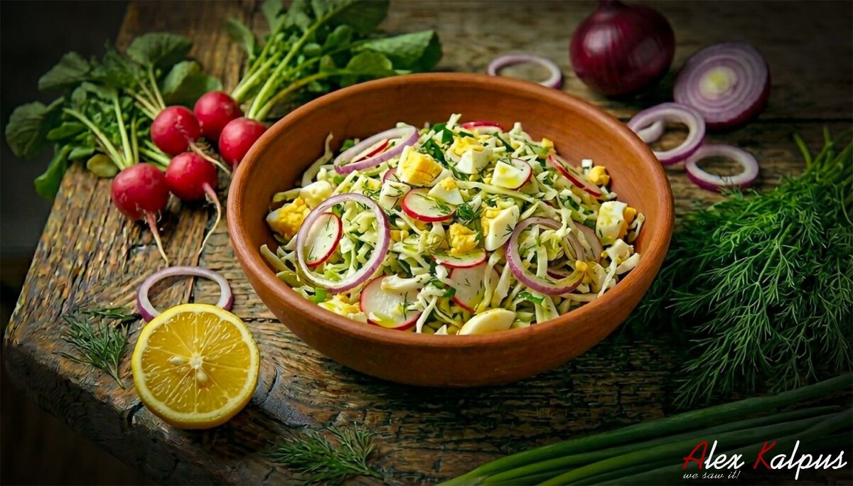 Этот салат — настоящая находка для тех, кто ценит быстрое приготовление без сложных ингредиентов. Он идеально подходит для весенних встреч и порадует любого гостя. Замечательное в этом салате то, что его можно сделать всего за пять минут. Достаточно поставить чайник, и пока он нагревается, салат уже будет готов.