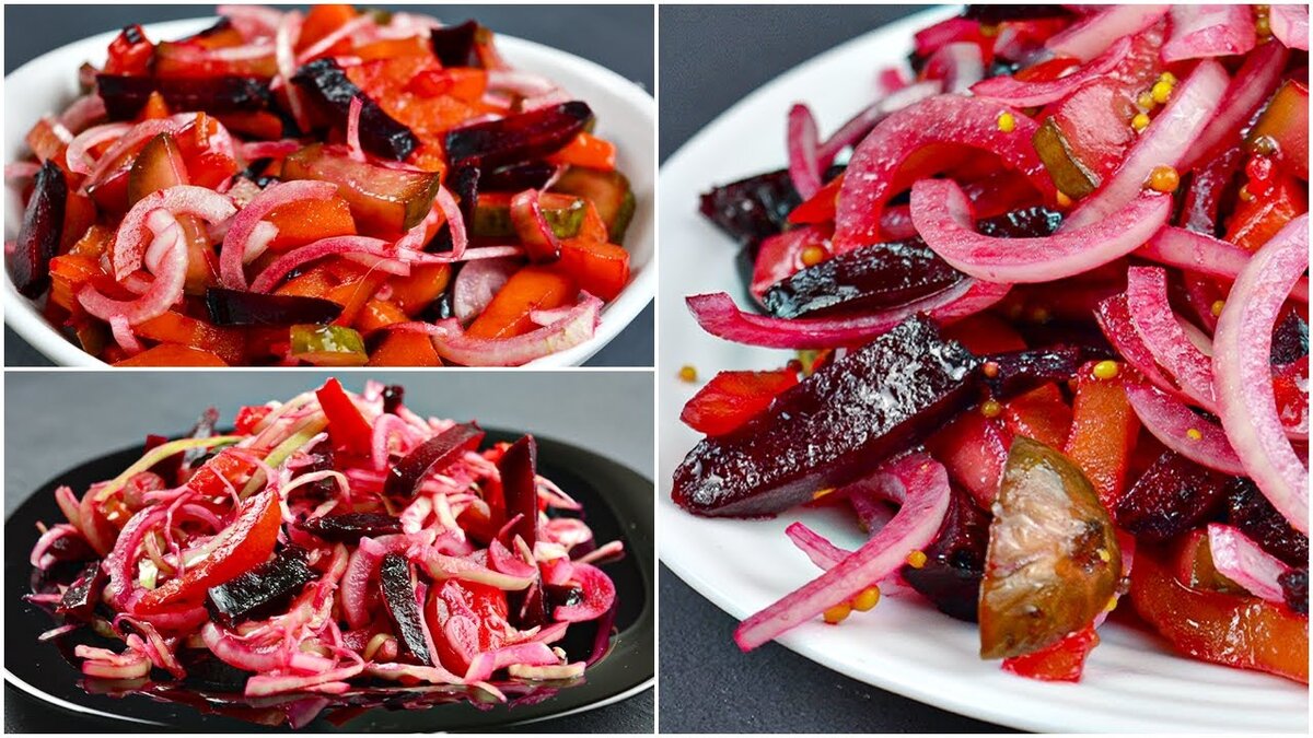 Для начала необходимо нарезать свеклу и вареную морковь тонкой соломкой, а лук — полукольцами. Огурец следует нарезать аналогично. Все подготовленные овощи нужно соединить в одной посуде и заправить яблочным уксусом и оливковым маслом. Добавьте немного дижонской горчицы и приправьте по вкусу солью. Перемешайте и подавайте к столу!