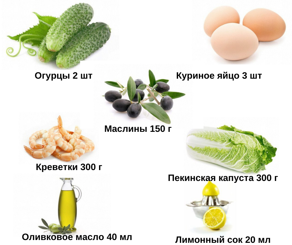 Сначала сварить креветки и яйца, затем очистить их от оболочки.Порезать капусту тонкими полосками, а огурцы — кубиками. Вареные яйца также нарезать на небольшие кусочки.Маслины аккуратно разрезать пополам.Приготовить соус, смешав свежевыжатый лимонный сок с оливковым маслом, добавить соль и перец по вкусу.Соединить все подготовленные ингредиенты в глубокой миске и заправить получившимся соусом.Салат получается легким и освежающим, идеально подходит для тех, кто следит за своим рационом. Для еще более разнообразного вкуса можно добавить любимые пряности или зелень. Приятного аппетита!
