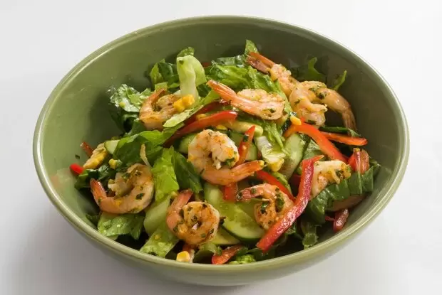В глубокой миске объединить рубленую петрушку, тертую апельсиновую цедру, растительное масло, раздавленный чеснок, соль и перец.Очистить креветки, оставляя хвостики, но удаляя кишки, и добавить их в маринад на 10–15 минут.Тем временем нарезать огурцы и салат, выложить в салатник.Авокадо очистить и нарезать, сбрызнуть апельсиновым соком, добавить в общий салат.Зелень перца чили нарезать, а затем приготовить заправку, смешав оливковое масло с апельсиновым соком, перцем и солью.На разогретом гриле, смазанном растительным маслом, обжарить кукурузу, периодически переворачивая, около 15–18 минут.На гриле также обжарить сладкий перец, чтобы он слегка размягчился и получил аромат дыма.Когда кукуруза почти готова, добавить креветки, жаря их по 2–3 минуты с каждой стороны.Срезать зерна с кукурузы и добавить в салат, нарезать сладкий перец и также включить в состав.Полить салат апельсиновой заправкой, перемешать и при необходимости добавить соль и перец.Украшать салат креветками и сразу подавать на стол!Этот салат не только порадует вкусом, но и украсит любой званый ужин. Приятного аппетита!