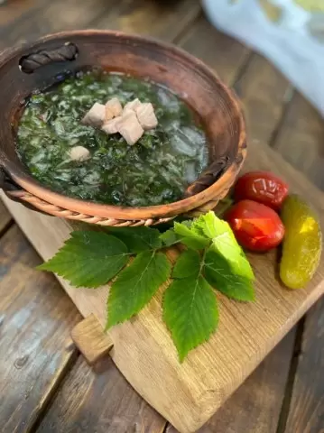Картошку отварить до готовности, а сныть бланшировать и нарезать. Рыбу отварить в подсоленной воде, а свежие огурцы натереть. Все ингредиенты смешать с квасом и подавать с отварной рыбой, картошкой и ржаным хлебом с солью. Кубики льда добавляют, чтобы сохранить прохладу блюда.