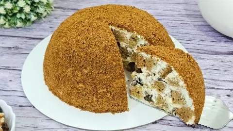 Для создания крема смешиваются сметана, творог и подсластитель. Предварительно чернослив заливают горячей водой, обмывают и нарезают, грецкие орехи рубят на мелкие кусочки. В литровую миску, выстланную пленкой, укладывают кусочки бисквита, обмокнув их в крем, между слоями посыпая орехами и черносливом. Слоеная структура формируется по желанию, как можно больше перекрывающих слоев.