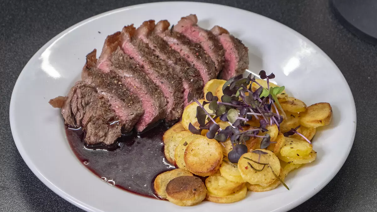 С соуса убираем все лишние ингредиенты и добавляем лимонный сок, а также столовую ложку сливочного масла. Хорошенько перемешиваем. Теперь осталось нарезать стейки, посолить, и красиво выложить на тарелку с картофелем. Поливаем винным соусом и украшаем микрозеленью.