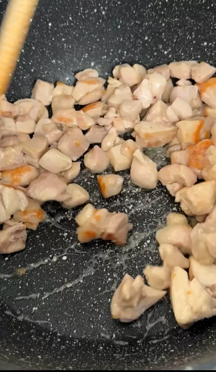Первым делом куриные бедра нарезают мелкими кусочками и обжаривают на растительном масле до золотистого цвета. Затем к ним добавляют нарезанные кубиками картофель, морковь и лук. Все это необходимо тушить около 10 минут, добавив специи.