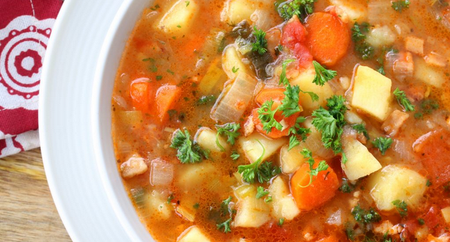 Сначала очистите лук, морковь, кабачки и перец от семян.Лук нарежьте полукольцами и слегка обжарьте на подсолнечном масле или масле смальца в глубокой сковороде до легкого золотистого оттенка.Морковь натрите на средней терке и добавьте к луку. Продолжайте тушить еще 10 минут на среднем огне.Следующий шаг — добавить тонко нарезанный болгарский перец. Продолжайте готовить еще 10 минут.Уменьшите огонь и накройте сковороду крышкой, тушите овощи дальше.Добавьте кабачок, натертый на терке или нарезанный кубиками, и тушите до мягкости.Теперь добавьте кубики помидоров и тушите еще 10 минут, пока овощи не выделят сок.Если сока недостаточно, добавьте один стакан бульона — овощного или мясного. Затем вводите картофель, нарезанный кубиками, и тушите до полного его приготовления.В конце добавьте сметану или сливки и продолжайте тушить еще 10 минут.Завершите приготовление, добавив чеснок, зелень, базилик, соль и перец. Тушите еще 5 минут для хорошей пропитки.Ваше блюдо готово! Приятного аппетита!