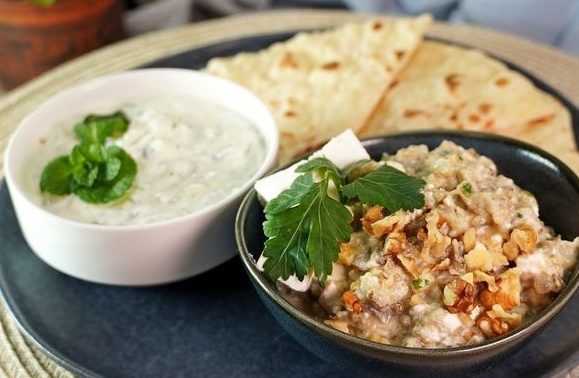 Свежую петрушку и оставшиеся орехи мелко рубим, а затем смешиваем с баклажанами, нарезанной фетой, чесноком и греческим йогуртом, добавляя лимонный сок, соль и перец по вкусу. Все ингредиенты перемешиваются до достижения однородной массы.