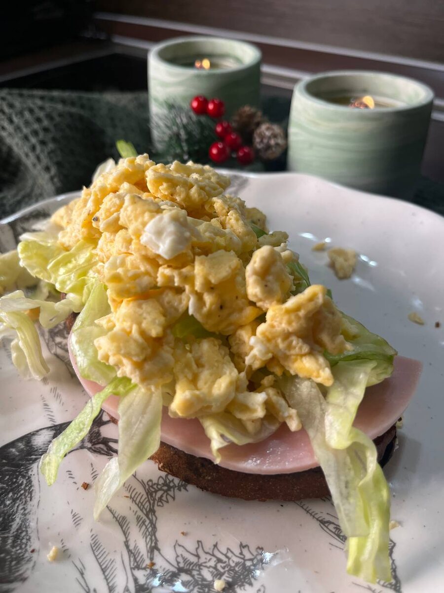 Для приготовления нужно всего 2-3 яйца и немного сливок. Итог: нежный, кремовый скрэмбл с бархатной текстурой. Он идеально сочетается с поджаренным хлебом. Хотя в идеале лучше подавать с красной рыбой, у меня её не было, и я выбрала более простой вариант. Хлеб намазала творожным сыром, покрасила салатом, добавила ветчину и, конечно, скрэмбл.