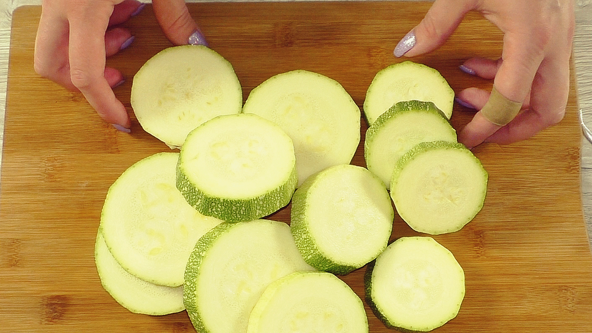 Первым делом нарезать кабачки кружочками средней толщины. Для удобства можно воспользоваться формой для печенья или стопкой, чтобы аккуратно извлечь сердцевину.