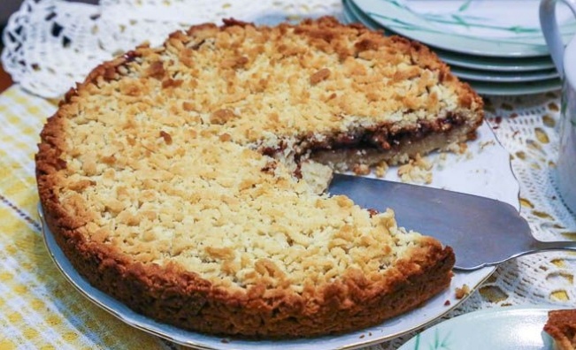 Тесто необходимо прижать руками, формируя бортики высотой 4-5 см. На основу выкладывается начинка — варенье или джем, а затем натирается оставшаяся часть теста, которая распределяется поверх начинки.