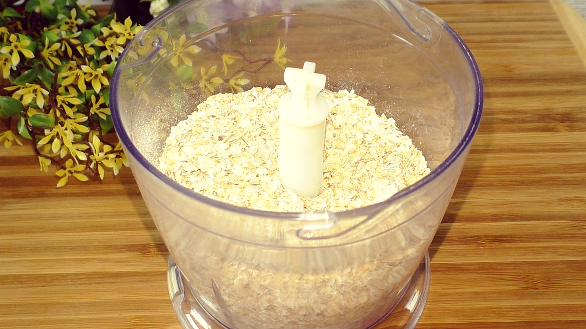 Для начала стоит взять овсяные хлопья. Можно использовать хлопья быстрого приготовления, но любые подойдут. Измельчаем их в блендере до состояния муки, и если у вас уже есть овсяная мука, смело используйте её.