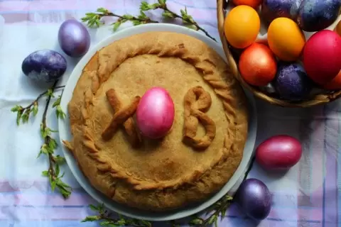 Курник готовится в духовке при температуре 180°C минимум 2 часа. Время выпекания может варьироваться в зависимости от характеристик вашей техники. Приятного аппетита всем, кто решит добавить этот традиционный пирог на свой пасхальный стол!