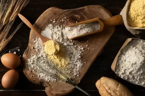 - Сильная мука (11,5–14% белка): Подходит для дрожжевого теста и заварных изделий. Эта мука активно впитывает жидкость и образует упругую клейковину, что помогает удерживать газ. Однако для бисквитов она не подходит, так как делает их плотными.