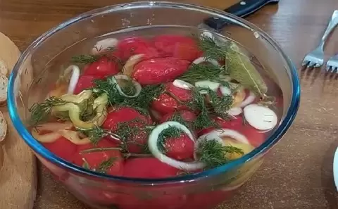 Быстрый маринованный салат из помидоров, лука и сладкого перца — простая и эффектная закуска, готовая уже через сутки. Сочетание свежих овощей, пряных трав и сбалансированного маринада добавит яркости к мясу на гриле и освежит любой семейный стол.