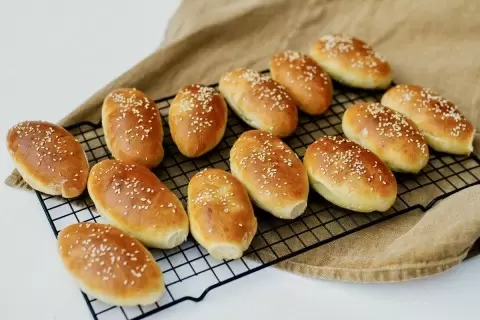 Выложить пирожки на противень швом вниз, смазать желтком и посыпать кунжутом. Выпекать при температуре 200°C до золотистой корочки.