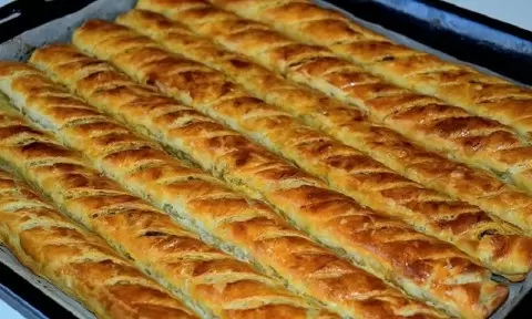 3. Формирование пирога: Раскатать каждую часть теста в прямоугольник, смазать маслом, выложить начинку и свернуть в рулет. Выложить трубочки на противень швом вниз, смазать сверху маслом и выпекать при температуре 180°C около 45 минут до золотистой корочки.