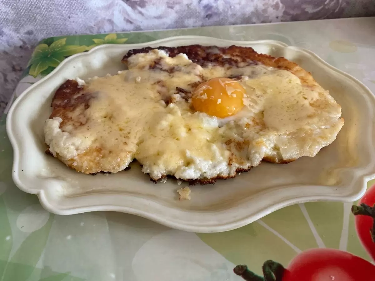 Влить туда желток и посыпать тертым сыром, продолжая готовить до полной расплавки сыра и легкого застывания желтка.