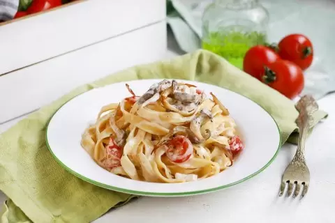 Смешивание: Объедините тальолини с соусом, аккуратно перемешивая. Помидоры черри разделите пополам и добавьте в конце приготовления. Подавайте блюдо горячим.