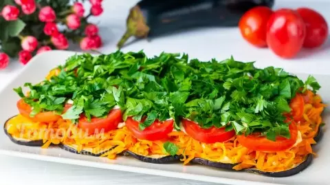 Обжаренные баклажаны в тандеме с обжаренной морковью создают удивительное сочетание, а свежие помидоры добавляют сочности, в то время как легкая пикантность чеснока придает оригинальность. Приготовить такую закуску — дело простое и быстрое!