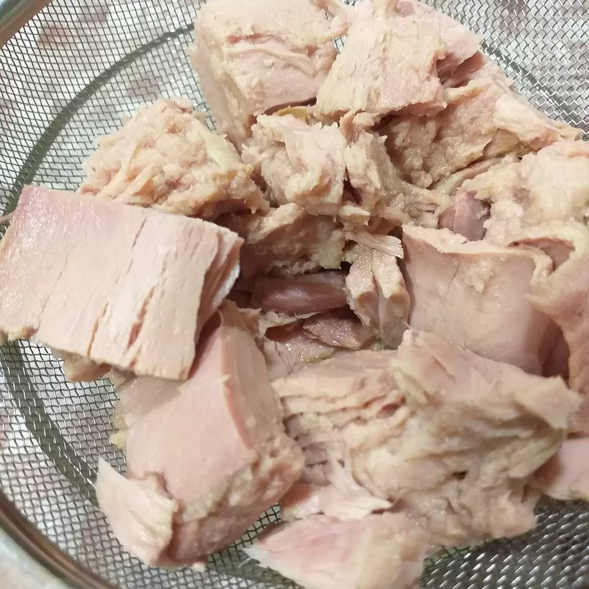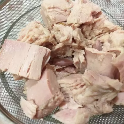 1. Консервированный тунец следует откинуть на сито, чтобы избавиться от лишней жидкости.