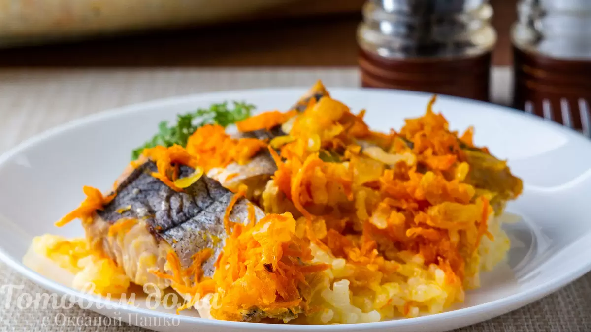 6. Разложите рыбу сверху на рис, а оставшиеся овощи выложите на хек.