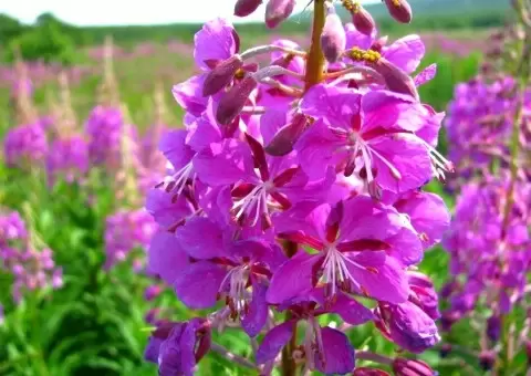 Иван-чай достигает высоты от 50 см до 2 метров, обладая прямыми стеблями, которые украшены узкими ланцетными листьями. Его цветы ярко-розового или малинового оттенка формируются в кистевидные соцветия на верхушках стеблей, расцветая с июня по август.