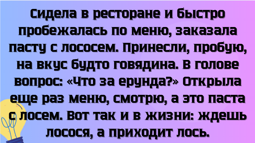 - Вопросы о мясе: Отец одного из посетителей, который не часто бывал в ресторане, задал официанту совершенно смешной вопрос о прожарке мяса: «А можно просто самое вкусное?» Это вызвало улыбки не только у официанта, но и у всех вокруг.